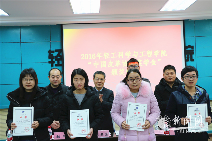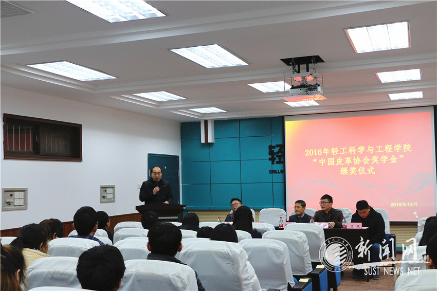 12月12日,我?!爸袊?guó)皮革協(xié)會(huì)獎(jiǎng)學(xué)金”2016年頒獎(jiǎng)儀式在實(shí)驗(yàn)樓1B第318號(hào)學(xué)術(shù)報(bào)告廳舉行。中國(guó)皮革協(xié)會(huì)名譽(yù)理事長(zhǎng)蘇超英、輕工科學(xué)與工程學(xué)院黨委副書(shū)記李曉、副院長(zhǎng)張輝、皮革教研室主任呂斌、院長(zhǎng)助理陳李斌出席了頒獎(jiǎng)儀式,儀式由輔導(dǎo)員秦永修主持。該獎(jiǎng)學(xué)金自1995年在我校輕工科學(xué)與工程學(xué)院設(shè)立,至今已有20余年歷史。