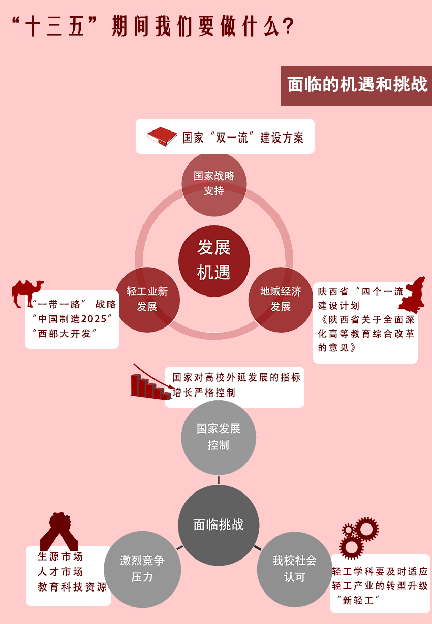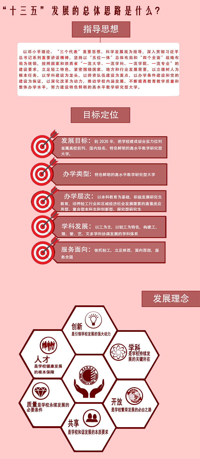 以鄧小平理論、“三個代表”重要思想、科學(xué)發(fā)展觀為指導(dǎo),深入貫徹習(xí)近平總書記系列重要講話精神,堅持以“五位一體”總體布局和“四個全面”戰(zhàn)略布局為統(tǒng)領(lǐng),按照國家和陜西省“一流大學(xué)、一流學(xué)科”的建設(shè)要求,立足輕工特色,緊密圍繞國家、地方和行業(yè)發(fā)展需要,以立德樹人為根本任務(wù),以學(xué)科建設(shè)為龍頭,以師資隊(duì)伍建設(shè)為重點(diǎn),以辦學(xué)條件建設(shè)和黨的建設(shè)為保證,以深化改革為動力,推動學(xué)校內(nèi)涵發(fā)展,不斷提高教育教學(xué)質(zhì)量和整體辦學(xué)水平,努力建設(shè)特色鮮明的高水平教學(xué)研究型大學(xué)。