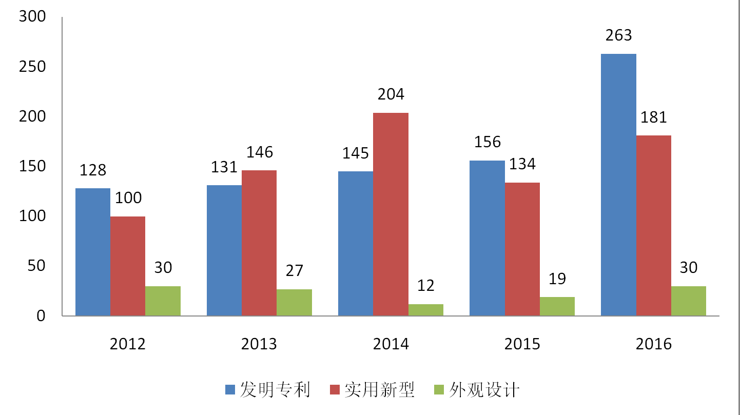 2012-2016年我校研究生中國(guó)專利授權(quán)統(tǒng)計(jì)圖