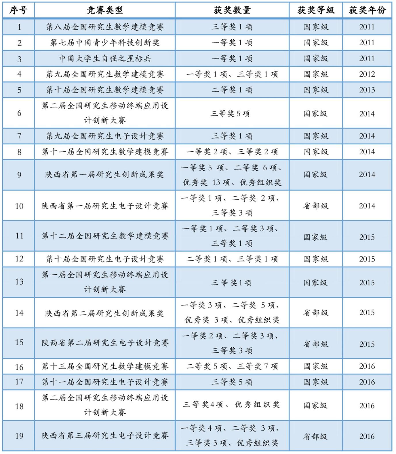 聚焦各類創(chuàng)新賽事,積極組織研究生參加教育部“研究生創(chuàng)新實(shí)踐系列活動(dòng)”、陜西省研究生創(chuàng)新成果展等國(guó)家和地方學(xué)科競(jìng)賽,近年來(lái)累計(jì)投入經(jīng)費(fèi)240萬(wàn)元,參加人數(shù)達(dá)到2100余人,先后斬獲國(guó)家級(jí)獎(jiǎng)項(xiàng)45項(xiàng),省部級(jí)獎(jiǎng)項(xiàng)59項(xiàng);其中在第一、二屆陜西省研究生創(chuàng)新成果展中獲一等獎(jiǎng)8項(xiàng),二等獎(jiǎng)11項(xiàng),優(yōu)秀獎(jiǎng)16項(xiàng),位列陜西省屬高校第一。