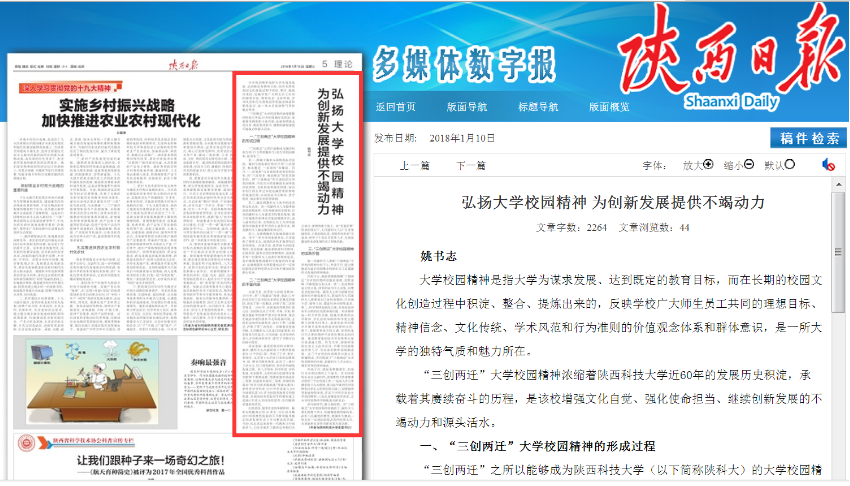 《陜西日?qǐng)?bào)》1月10日理論版刊發(fā)了我校黨委書記姚書志的署名文章《弘揚(yáng)大學(xué)校園精神 為創(chuàng)新發(fā)展提供不竭動(dòng)力》。