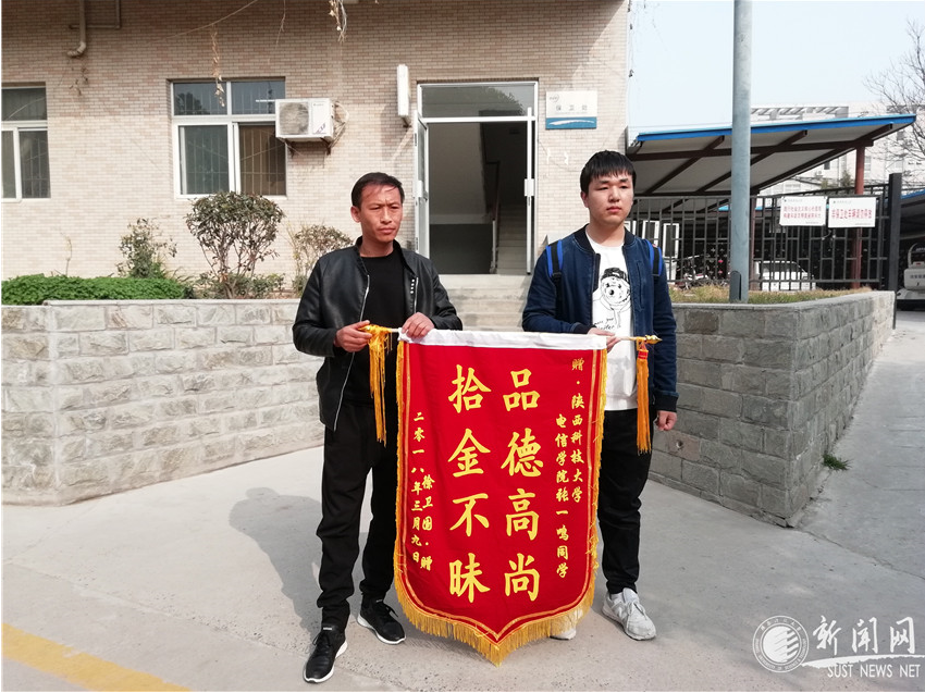 來自陜西榆林的徐衛(wèi)國先生3月12日一大早就趕到陜西科技大學(xué),分別將寫有“拾金不昧,忠誠衛(wèi)士”和“拾金不昧,品德高尚”的兩面錦旗,鄭重地送到學(xué)校保衛(wèi)處、電氣與信息工程學(xué)院大四學(xué)生張一鳴手中,以此表達(dá)他深深的謝意。3月5日晚上10點(diǎn)左右,張一鳴同學(xué)在杜家堡十字路口撿到一個(gè)紅色塑料袋,發(fā)現(xiàn)內(nèi)有錢包一個(gè)、現(xiàn)金一萬余元、銀行卡若干和身份證。他將物品交至校保衛(wèi)處。經(jīng)學(xué)校保衛(wèi)處努力,于3月8日成功聯(lián)系上失主徐衛(wèi)國。