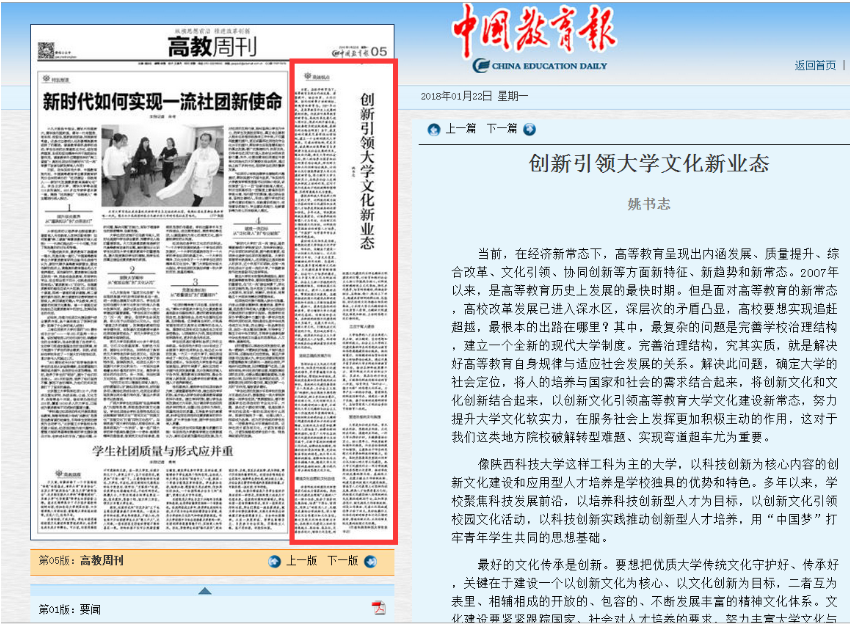 《中國教育報(bào)》2018年1月22日《高教周刊》版“高端視點(diǎn)”欄目刊發(fā)我校黨委書記姚書志署名文章《創(chuàng)新引領(lǐng)大學(xué)文化新業(yè)態(tài)》。