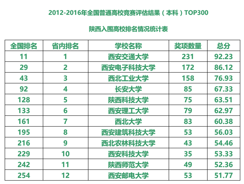 根據(jù)12月14日中國(guó)高等教育學(xué)會(huì)《高校競(jìng)賽評(píng)估與管理體系研究》專家工作組預(yù)發(fā)布《中國(guó)高校創(chuàng)新人才培養(yǎng)暨學(xué)科競(jìng)賽評(píng)估結(jié)果》,我校入圍2012-2016全國(guó)普通高校競(jìng)賽評(píng)估結(jié)果(本科)“TOP300”,居省屬高校第一,陜西高校排名第5,全國(guó)高校列128名。