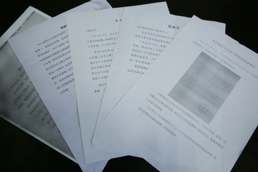 2017年5月8日,一封來(lái)自食品與生物工程學(xué)院的感謝信交到了后勤集團(tuán)辦公室,信中這樣說(shuō):“食品學(xué)院一層學(xué)生會(huì)辦公室內(nèi)下水管道出口處被異物堵塞,持續(xù)降雨后造成四樓屋頂積水從堵塞的下水管道反流倒灌,辦公室大面積滲水積水,嚴(yán)重影響正常工作。正在師生們焦慮之時(shí),動(dòng)力服務(wù)中心在接到維修電話(huà)后第一時(shí)間委派葛磊、李建文、方雨超趕赴現(xiàn)場(chǎng),加班到晚上九點(diǎn)左右,對(duì)漏水的下水管道及周邊堵塞區(qū)進(jìn)行疏通和維修,并利用周末休息時(shí)間再次對(duì)下水管道地下管路和出水口進(jìn)行徹底檢查和維修,進(jìn)一步排除后續(xù)漏水隱患。我們對(duì)貴單位的及時(shí)處置效率、負(fù)責(zé)態(tài)度和員工敬業(yè)奉獻(xiàn)、不抱怨的職業(yè)精神表示敬佩和感謝!”