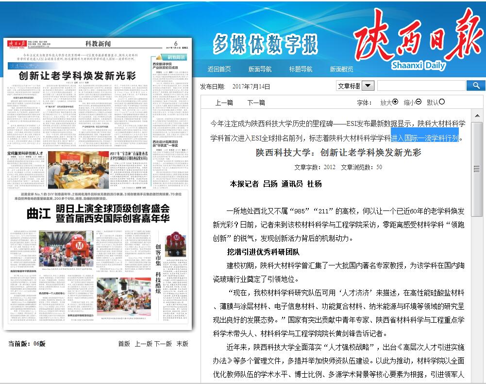 《陜西日報》7月14日在科教新聞版刊發(fā)了以《陜西科技大學:創(chuàng)新讓老學科煥發(fā)新光彩》為題的長篇通訊,大篇幅報道了我校材料科學學科進入國際一流學科行列及其學科建設取得的突出成績。