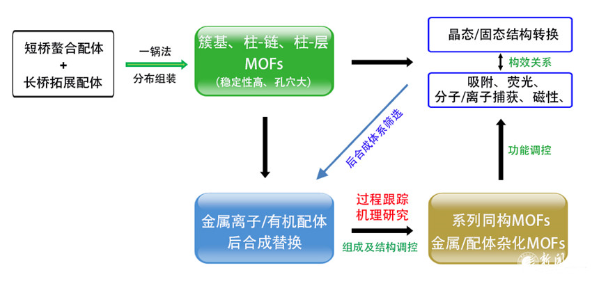 項(xiàng)目的研究重點(diǎn)是利用特定結(jié)構(gòu)MOFs為母體,探尋后合成金屬離子或有機(jī)配體替換的新實(shí)例和新路線。研究金屬離子、配體,溶劑、濃度、溫度,抗衡離子等反應(yīng)條件等對(duì)后合成替換速率,反應(yīng)位點(diǎn),替換完整性、可逆性的影響;以及多金屬或多配體共存體系中后合成替換的競(jìng)爭(zhēng)性與選擇性,獲得對(duì)反應(yīng)機(jī)理的理性認(rèn)識(shí)。通過(guò)后合成替換反應(yīng)條件控制,獲得金屬離子、有機(jī)配體不同的系列同構(gòu)MOFs,以及可能的多金屬/配體共存型雜化MOFs。研究后合成替換對(duì)框架整體/局部、孔穴結(jié)構(gòu),及吸附、分子/離子捕獲、熒光、磁性、催化等可能性質(zhì)的調(diào)控。