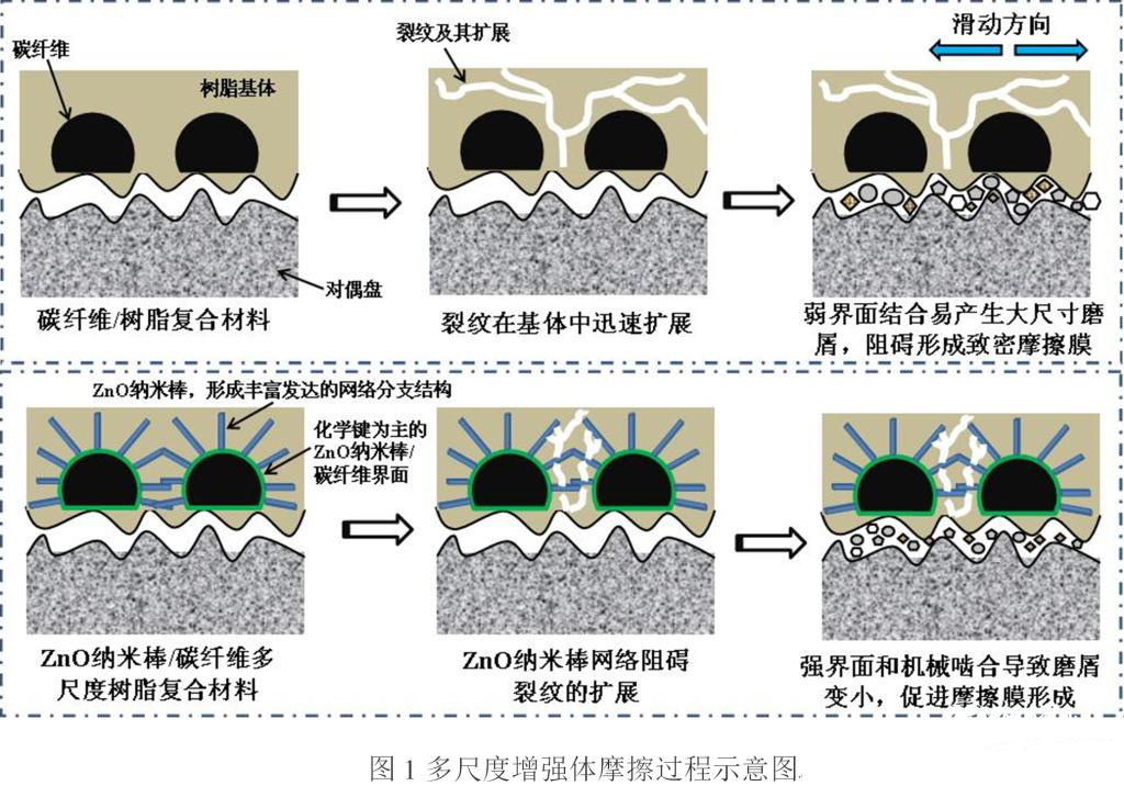 濕式摩擦材料主要應(yīng)用于汽車中的自動變速器、差速器、扭矩管理器和同步器等濕式傳動/制動系統(tǒng)中,其厚度僅為0.40-0.80mm,但摩擦表層需要承受高速剪切、摩擦熱沖擊以及高溫潤滑油浸蝕等苛刻條件。通俗來講,碳纖維增強的復(fù)合材料類似于鋼筋混凝土結(jié)構(gòu)。我們都知道在鋼筋表面垂直焊接固定較短的鋼筋,則在澆筑混凝土后能進一步提高整體性能?;诖?,我們在不破壞碳纖維結(jié)構(gòu)和性能的前提下,在碳纖維表面接枝易于與樹脂基體反應(yīng)的官能團,采用液相法在碳纖維表面垂直生長納米棒,形成典型的“狼牙棒”結(jié)構(gòu),使增強體“犬牙交錯”狀分布在基體中,則可大幅度改善其與基體的結(jié)合,使復(fù)合材料在摩擦過程中更加穩(wěn)定,提高摩擦磨損性能,進而延長摩擦副的使用壽命,多尺度增強體在摩擦磨損過程中的作用如圖1所示。通過該研究,可以為摩擦材料的多尺度設(shè)計提供指導,進而為汽車濕式傳動/制動系統(tǒng)摩擦副產(chǎn)品的更新?lián)Q代提供理論支撐和技術(shù)服務(wù)。