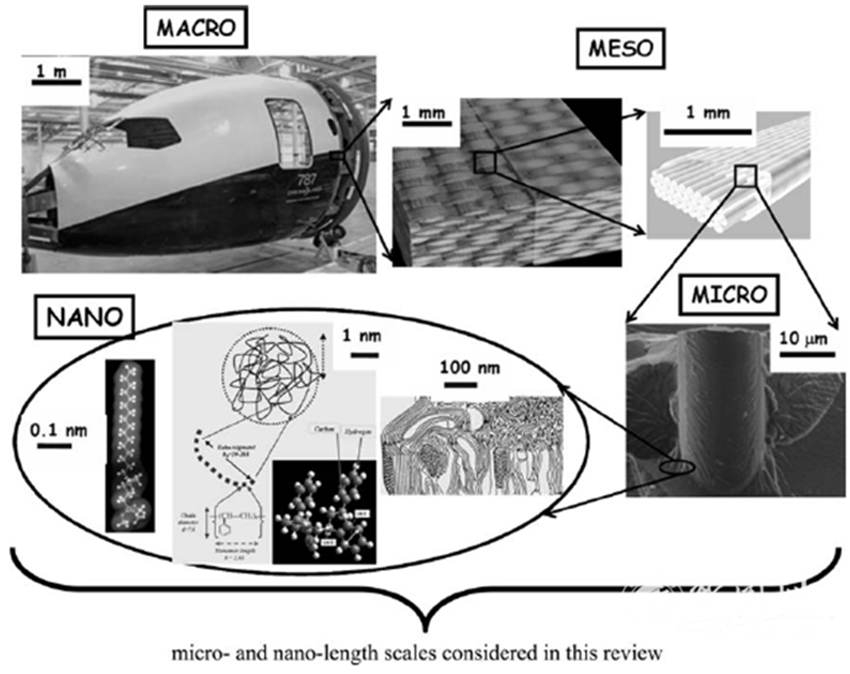 圖2 波音787用樹(shù)脂基復(fù)合材料結(jié)構(gòu)件的多尺度設(shè)計(jì)(納觀(guān)-微觀(guān)-介觀(guān)-宏觀(guān)) [圖片引自Journal of Materials Science, 2008, 43(20): 6747-6757]