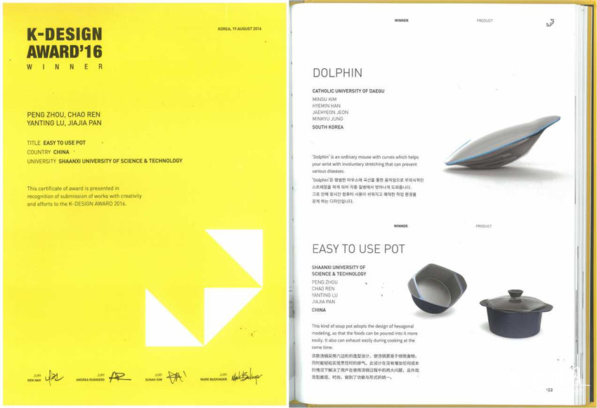 2016韓國K-DESIGN國際設(shè)計獎評獎結(jié)果于9月公布,我校設(shè)計與藝術(shù)學(xué)院2014級藝術(shù)設(shè)計研究生魯燕婷(導(dǎo)師:楊曉燕)在實習(xí)單位完成的作品《EASY TO USE POT》喜獲“Winner Award’2016”獎項。
