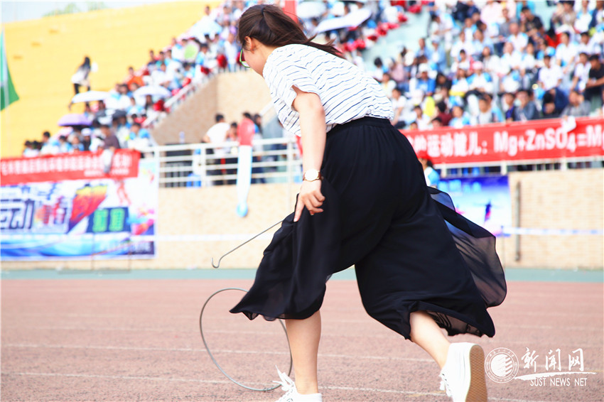 大學(xué)生組男女混合滾鐵環(huán)項目于上午8:35舉行,共10隊分兩組舉行,選手來回接力滾鐵環(huán),鐵環(huán)掉落或者亂道都會導(dǎo)致名次落后。選手們來回穿梭,鐵環(huán)快速旋轉(zhuǎn)沖向終點。一名比賽完的女同學(xué)說:“盡管我鐵環(huán)掉落,但是我還是必須重新出發(fā),奔向終點?!边@種趣味性的項目同樣體現(xiàn)著堅持不懈的體育精神。最終,機電學(xué)院榮獲第一名。