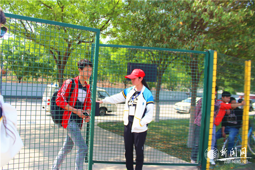 志愿者分為16組,共計100多人,戴著顯眼的小紅帽,他們主要協(xié)助裁判、參賽成員、賽場秩序搬運比賽用的器材、管制賽場流程、幫忙檢錄、恢復(fù)場地等,跑道上的志愿者還要為運動員們驅(qū)散跑道上的人員。在標(biāo)準(zhǔn)田徑場的南門默默站立著一位小姑娘,她的責(zé)任就是為同學(xué)開關(guān)門。看似小小的舉動,但在烈日炎炎下,能堅持下來的,也只有像她一樣的志愿者了吧。
