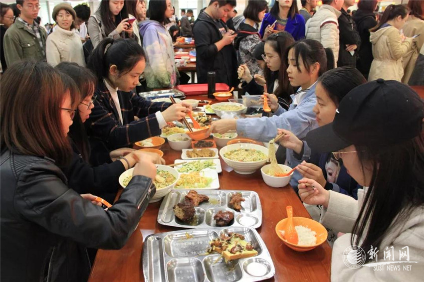 美食節(jié)上我校張征、梁小龍兩位廚師烹制的臊子面一經(jīng)推出,大受歡迎,師生們?cè)谖倚=涣鞔翱谂牌鹆怂陌俣嗝组L(zhǎng)的隊(duì)伍,迫不及待地品嘗湯鮮味美的關(guān)中臊子面,一碗碗“薄、筋、光,煎、稀、汪,酸、辣、香”的臊子面讓江南大學(xué)師生豎起大拇指,許多同學(xué)在品嘗后表示:“臊子面酸辣鮮香,筋道彈牙,頗具西北風(fēng)味,為師生的餐桌增添了一道亮麗的風(fēng)景線,像這樣的伙食交流很棒!”兩位師傅還在現(xiàn)場(chǎng)為師生展示扯面技能,引來(lái)師生陣陣歡呼。