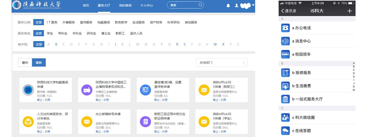 移動門戶以微信企業(yè)號為入口,命名為“iS科大”,有“愛陜科大”、“信息陜科大”、“智慧陜科大”等多重含義,是面向教師、學(xué)生、管理者提供的各種應(yīng)用聚合服務(wù),通過移動信息化手段提高辦公效率,提升服務(wù)質(zhì)量。目前可為教職工提供辦公電話查詢、班車查詢、答題、報修、生活繳費、信息發(fā)布、表單提交、微信提醒等服務(wù)。