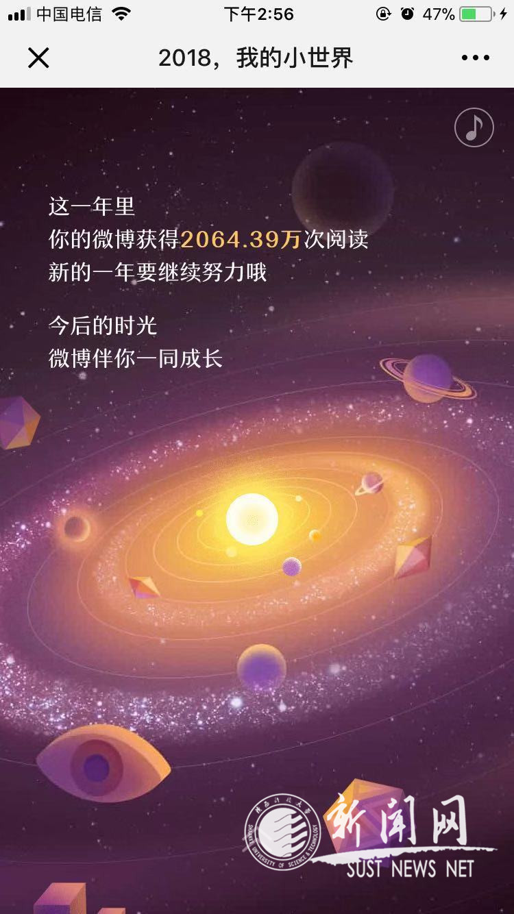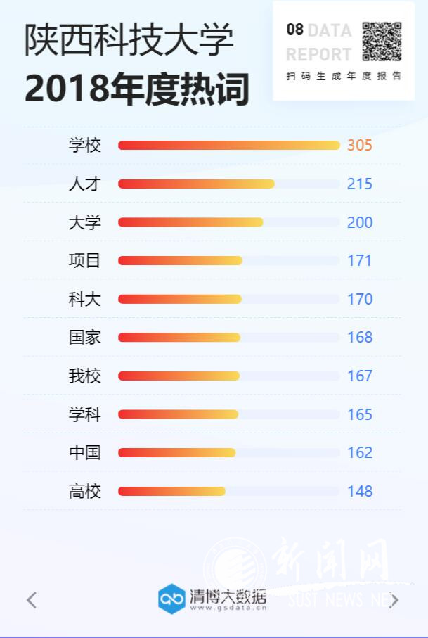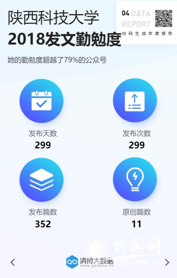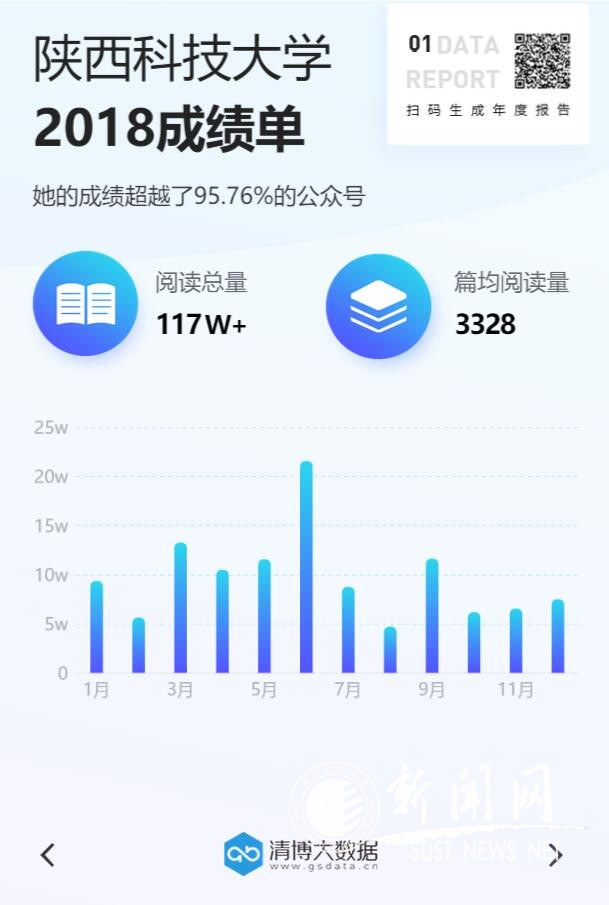 數(shù)據(jù)顯示。微信平臺以117萬總閱讀量,3328篇均閱讀量的總成績超越了95.76%公眾號,其傳播指數(shù)WCI 812.78超越了96%的公眾號。2018年微信共發(fā)布299天,推送352篇圖文,收獲2萬+個(gè)點(diǎn)贊,勤勉度超越了79%的公眾號。其中《甲子校慶丨陜西科技大學(xué)宣傳片、畫冊、大事記震撼首發(fā)》以當(dāng)周4萬+閱讀數(shù)榮登最熱文章,“人才”、“項(xiàng)目”、“學(xué)科”等詞匯被評為我校年度熱詞。