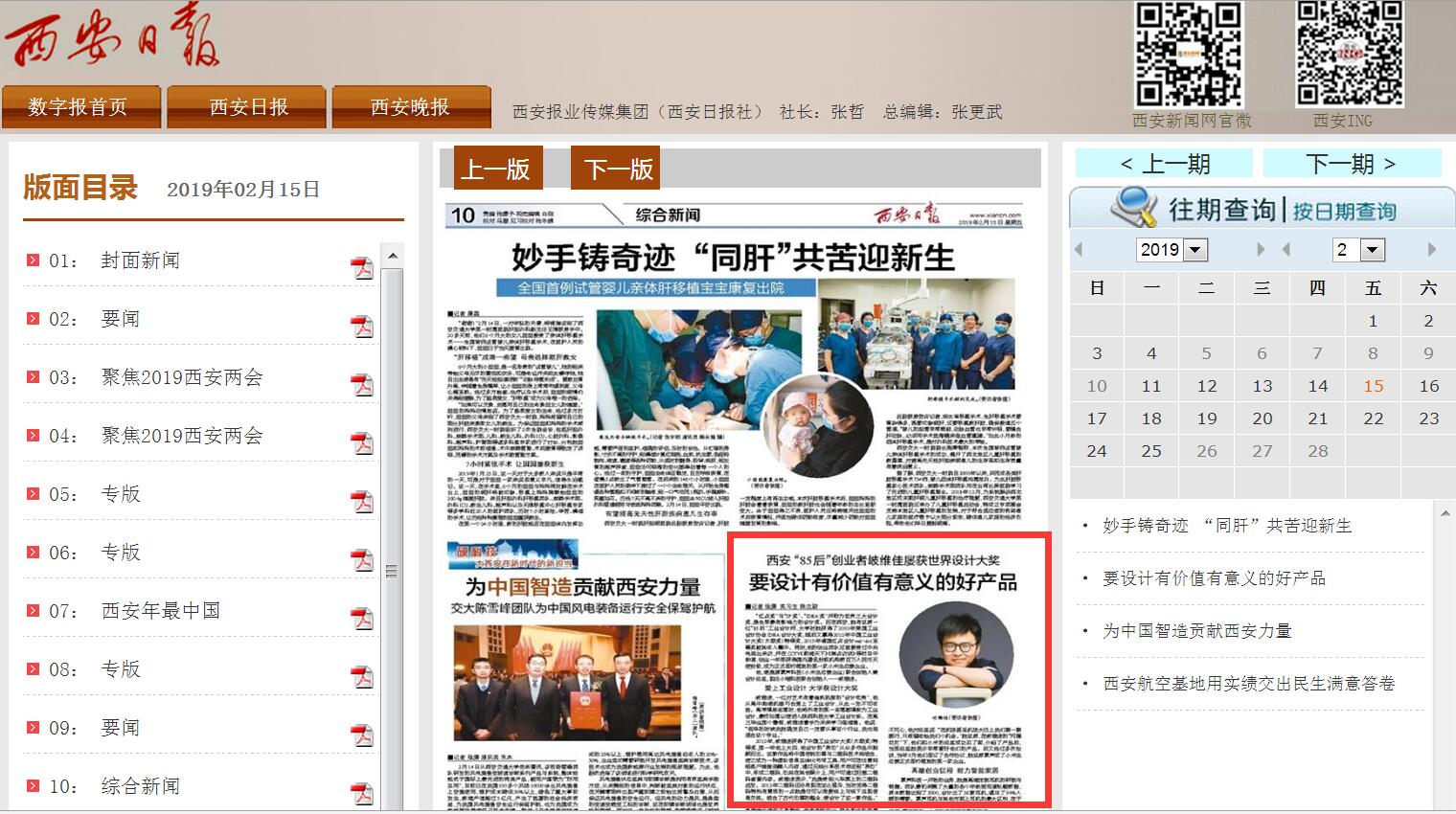 《西安日?qǐng)?bào)》02月15日以《西安 “85后”創(chuàng)業(yè)者岐維佳屢獲世界設(shè)計(jì)大獎(jiǎng)》為題,長(zhǎng)篇報(bào)道我校2012屆畢業(yè)生、小喵科技聯(lián)合創(chuàng)始人岐維佳創(chuàng)業(yè)之路。全文轉(zhuǎn)載如下: