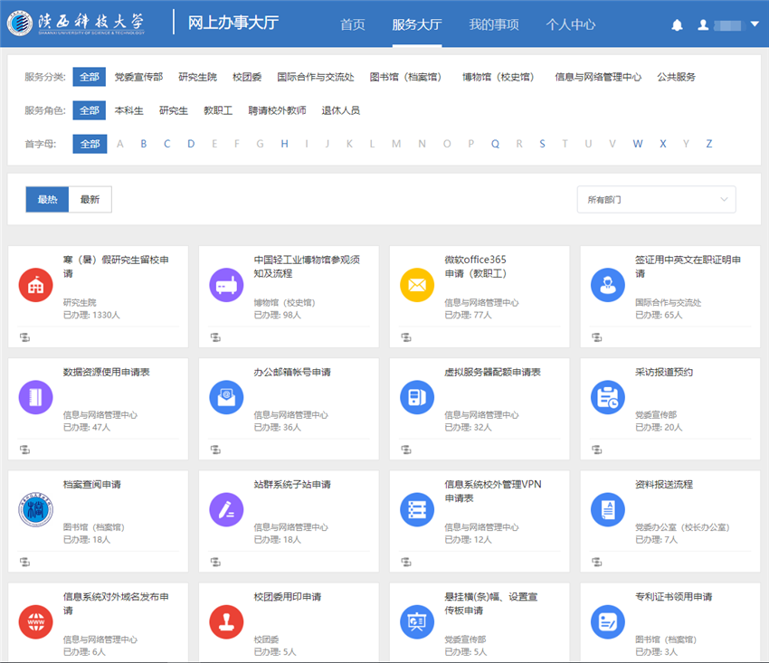經(jīng)過與多個職能部門的反復溝通、制作、測試,目前,“網(wǎng)上辦事大廳”已建事項50余項,第一批發(fā)布事項22項,涉及黨委宣傳部、校團委、研究生院、國際處、檔案館、中國輕工業(yè)博物館等部門,包括采訪報道預約、橫幅懸掛申請、研究生寒暑假留校申請、博物館參觀預約、簽證用中英文在職證明、校團委用印、檔案查閱、專利證書領用、站群子站申請、學生郵箱激活等多項事項的申請和審批流程。