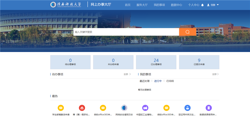 點擊https://service.sust.edu.cn,使用我校統(tǒng)一身份認證的用戶名和密碼登錄?;蛳鹊卿?/span>陜西科技大學綜合門戶,點擊“網(wǎng)上辦事大廳”進入。