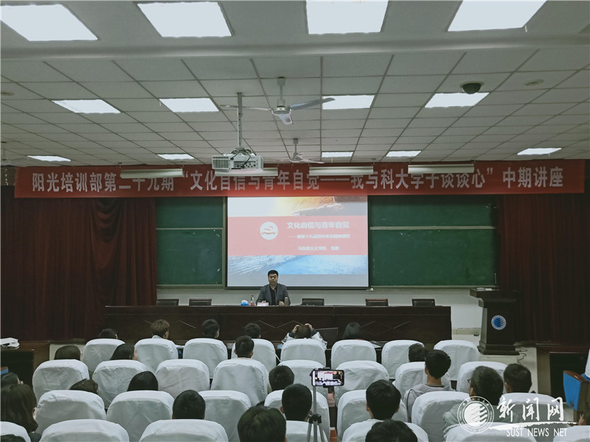 黨的十九屆四中全會精神在我校廣大師生中引起強烈反響,廣大青年學(xué)子熱切期盼能更深刻細致地領(lǐng)會全會精神,各部門紛紛自覺開展學(xué)習(xí)活動。為此,我校陽光助學(xué)中心于11月17日晚,舉辦“黨的十九屆四中全會精神宣講會”,邀請我校馬克思主義學(xué)院“思想道德修養(yǎng)與法律基礎(chǔ)”教研部主任范昕,為廣大科大學(xué)子做了名為《文化自信與青年自覺——兼談黨的十九屆四中全會精神領(lǐng)悟》的專題講座。來自各個學(xué)院的300余名大學(xué)生參加了講座。