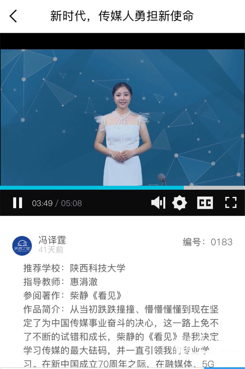 日前,在天津財經(jīng)大學(xué)舉辦的第四屆全國“大學(xué)生閱讀推廣高峰論壇(2019)”上,我校圖書館推送的設(shè)計與藝術(shù)學(xué)院馮譯霆同學(xué)以演講原創(chuàng)作品《新時代,傳媒人勇?lián)率姑帆@首屆全國大學(xué)生“悅讀之星”榮譽表彰。